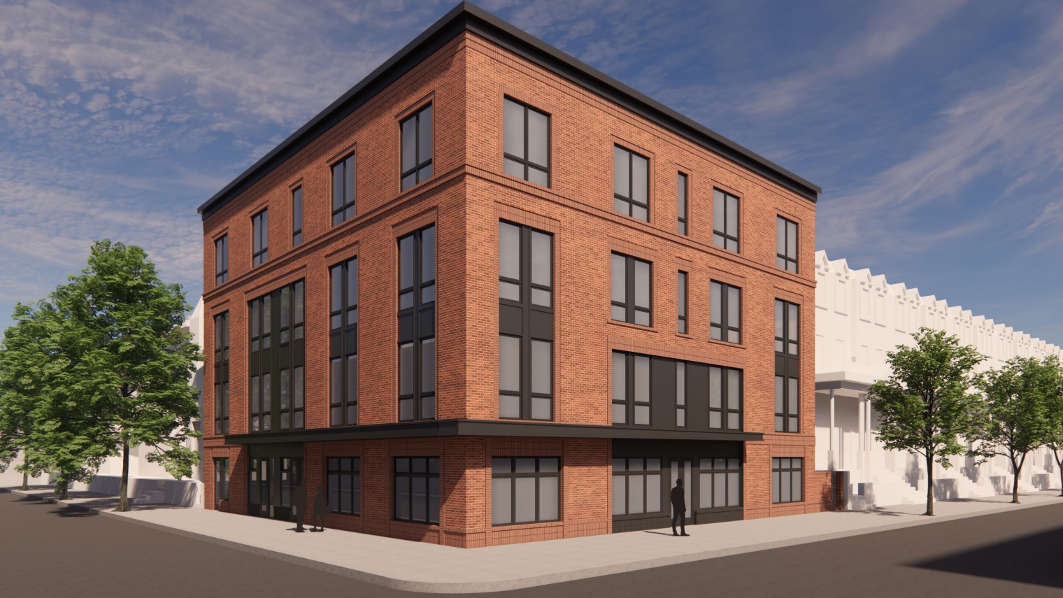 This corner has plans for an upgrade, which we know about thanks to a submission to the Historical Commission – something that would not have happened prior to the creation of the historic district. Gnome Architects presented plans for a 15-unit, mixed-use building for this corner, adding substantial density to this formerly auto-friendly business. The CMX-2 zoning allows for the inclusion of commercial space, but the zoning and the historic needs of the area split after that. A rectangularly-shaped massing is proposed here, in clear contrast with the stepped-back and more intricate forms of the other adjacent buildings. Brick is planned to be prominently featured on the main facades, with an awning wrapping around the building to cover both the residential and commercial entrances.