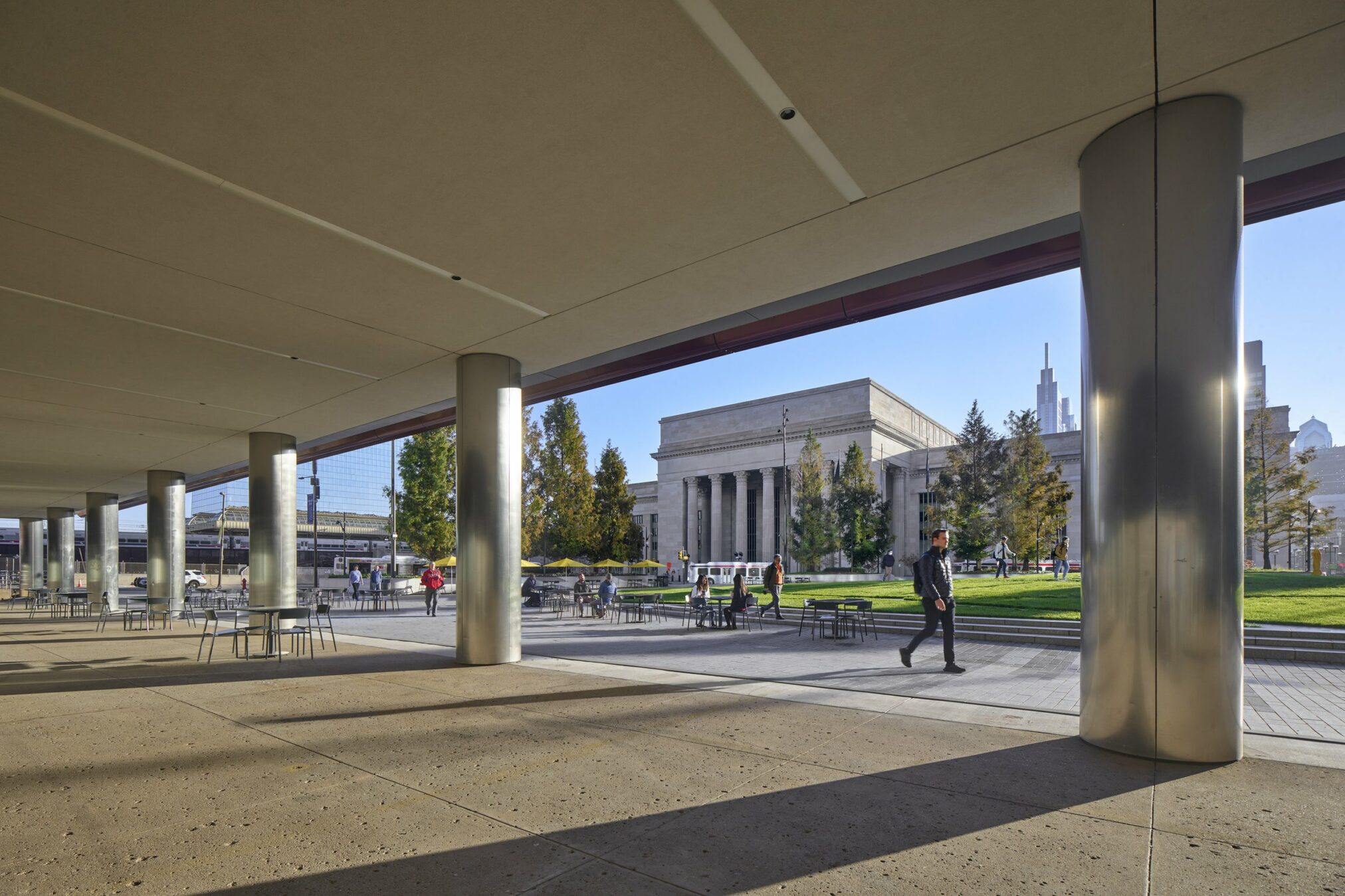 Picture yourself walking out of the western side of 30th Street Station, emerging from the Amtrak tracks below, and being greeted by… pretty much nothing. This was life several years back before Drexel Square, the public park that was the first completed aspect of the massive Schuylkill Yards master plan from Drexel University and Brandywine Realty Trust. Formerly a walled-off parking lot that led to Megabus lines along the sidewalk, this verdant new park encircled by redwood trees is now a welcoming new entrance to the revamped Bulletin Building and University City. Formerly home to the Philadelphia Evening Bulletin, which was published until the early ’80s, the building received a facelift several years back and is now home to Spark Therapeutics‘ headquarters.