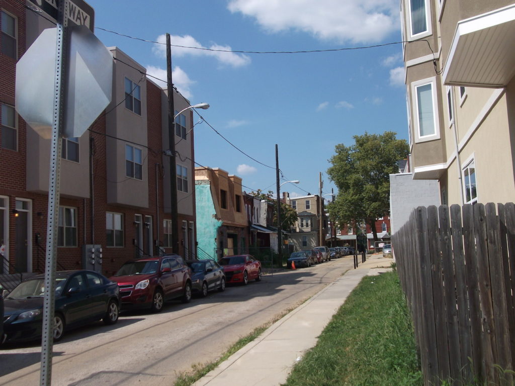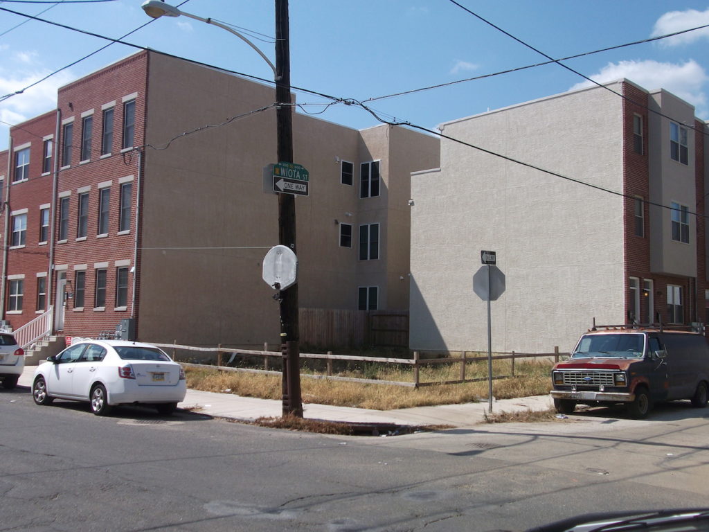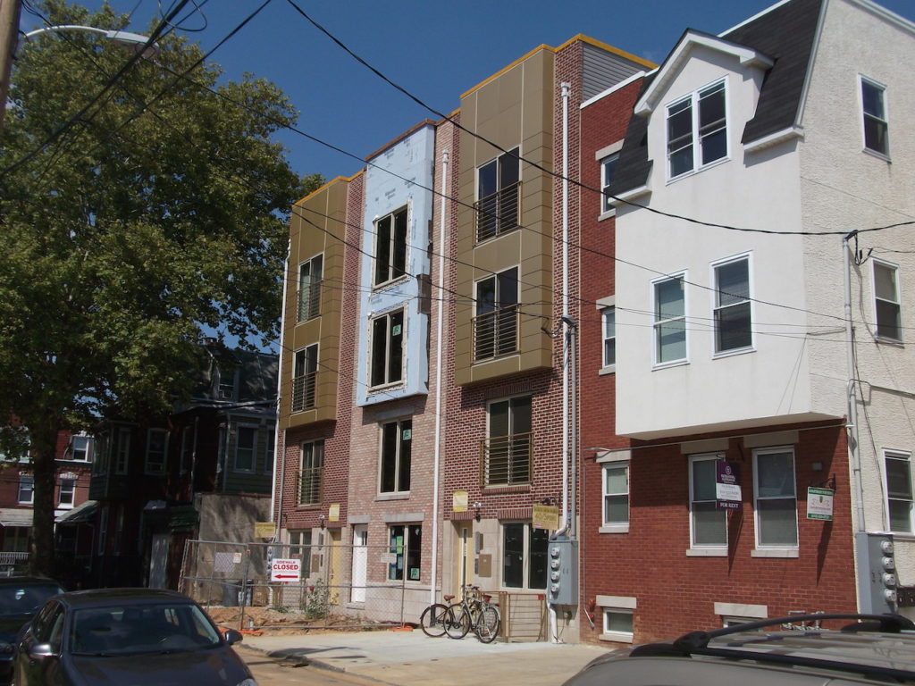 The 400 block of Wiota Street is a rather quiet residential block in West Powelton, just north of the very bustling 4000 block of Baring Street. Prior to this decade, the street, and many of the surrounding blocks, were rife with vacant lots and structures. Now, due to its proximity to the college campuses of University City, the street is a major construction zone. As we walked from the northern end of the block, we spied three brand spanking new apartment buildings in a row, at 439 Wiota Street, which are part of a project called 40/Spring which also encompasses similar looking buildings around the block on 40th Street. We checked in on this site last fall and now the project is just about finished and most of the units are already reserved or occupied.