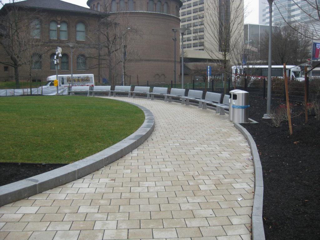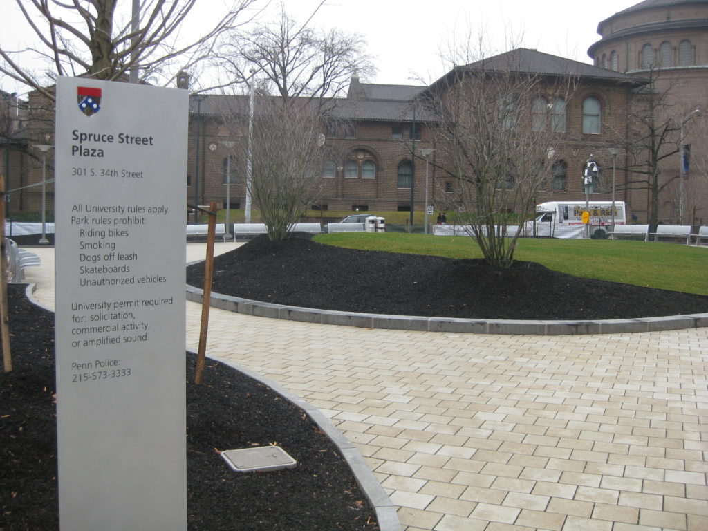 As you can see below, the $2.5M project was a huge success. As expected, the plaza includes benches, new lighting, decorative paving, landscaping, and a (still to come) small lawn area. Matthews Nielsen Landscape Architects and Urban Engineers were the designers behind the project, which really changes the feeling of the streetscape for pedestrians and drivers alike.In some ways, this little oasis feels like an extension of Penn Park, the 24-acre green space that was established a little over a year ago on the far eastern end of Penn’s campus and about a block away from the new plaza. For this new and considerably smaller space, one other notable difference is just how easy it is to find a way in. But beggars can’t be choosers, it’s great to have even more public green space on this side of West Philly, and to see a surface parking lot utilized for the greater public benefit.