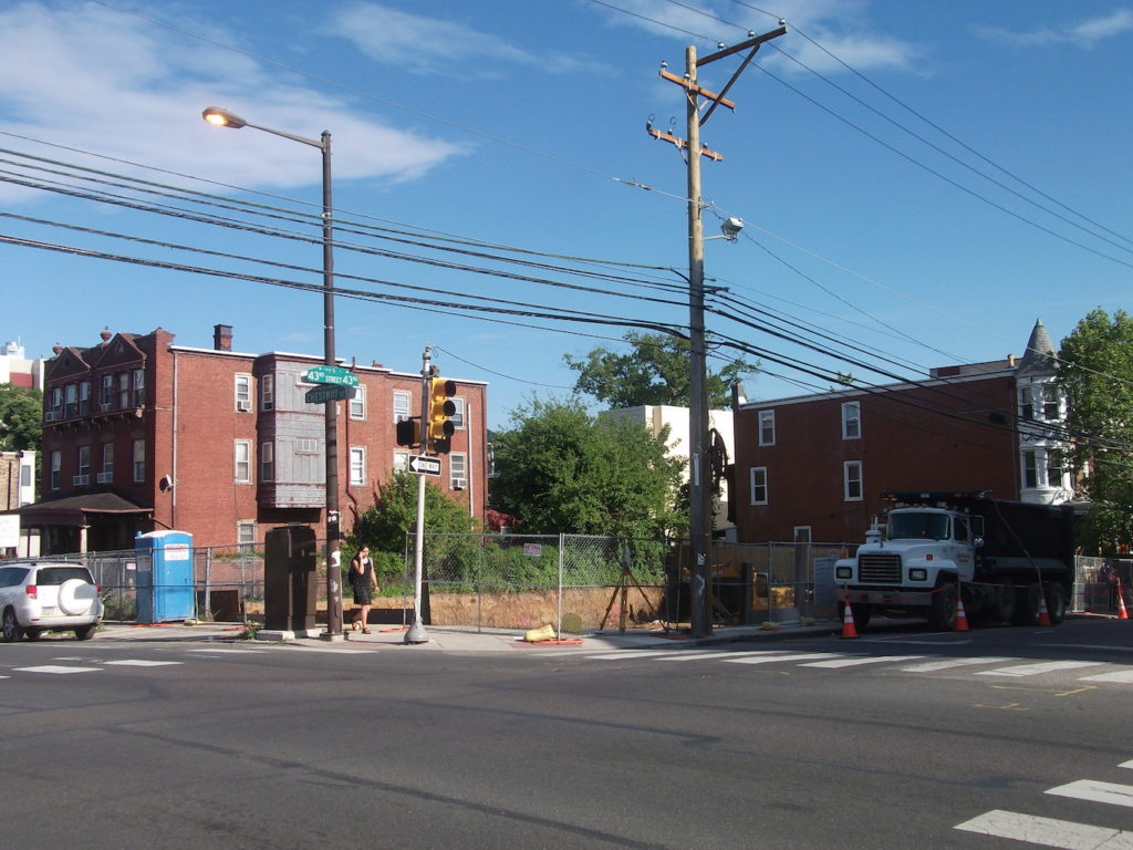 Moving right along, the southeast corner of 43rd & Chestnut has been a useless vacant parcel for at least a decade. From what we have found on construction permits and property records, it looks like the developer here is a very familiar face to the University City neighborhood, University Realty. University Realty is the same company that has developed large student housing properties on the 4000 block of Chestnut Street and at the corner of 46th and Walnut and we expect this property to look similar to these, with parking on the first floor and apartments above. For now though, the property is still in site preparation mode.