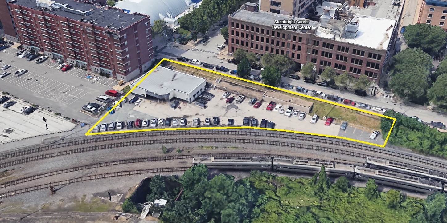 Labs, labs, labs – have we ever mentioned labs on here? Well, we are thrilled to be talking about yet another one at 127 N. 32nd St., where a surface parking lot on the very edge of Drexel is in for an ultra-upgrade. Currently home to a small one-story building and a fenced-off, paved lot, it would be easy to miss this property that directly abuts 32nd St. to the west and the giant 30th Street Station railyard to the east. But we are thrilled to report that this trapezoidal lot is now one happy property, with zoning approval to combine the existing parcels into one. Checking out the current site shows just how underutilized this prime spot is.