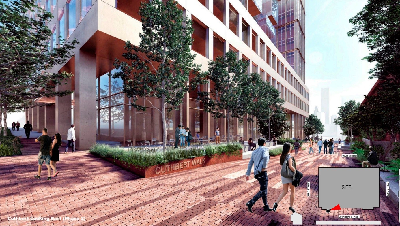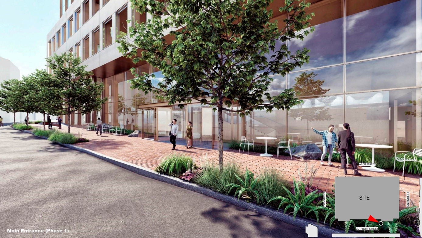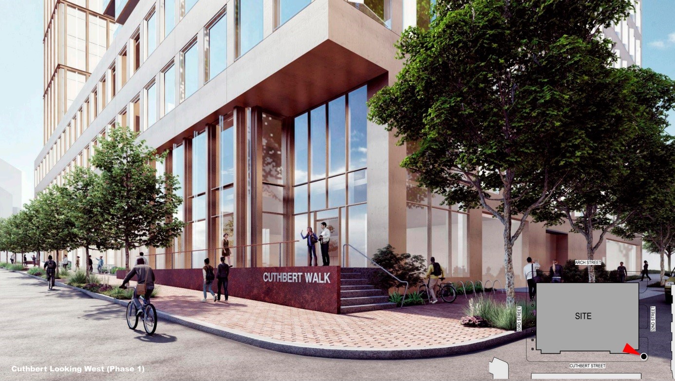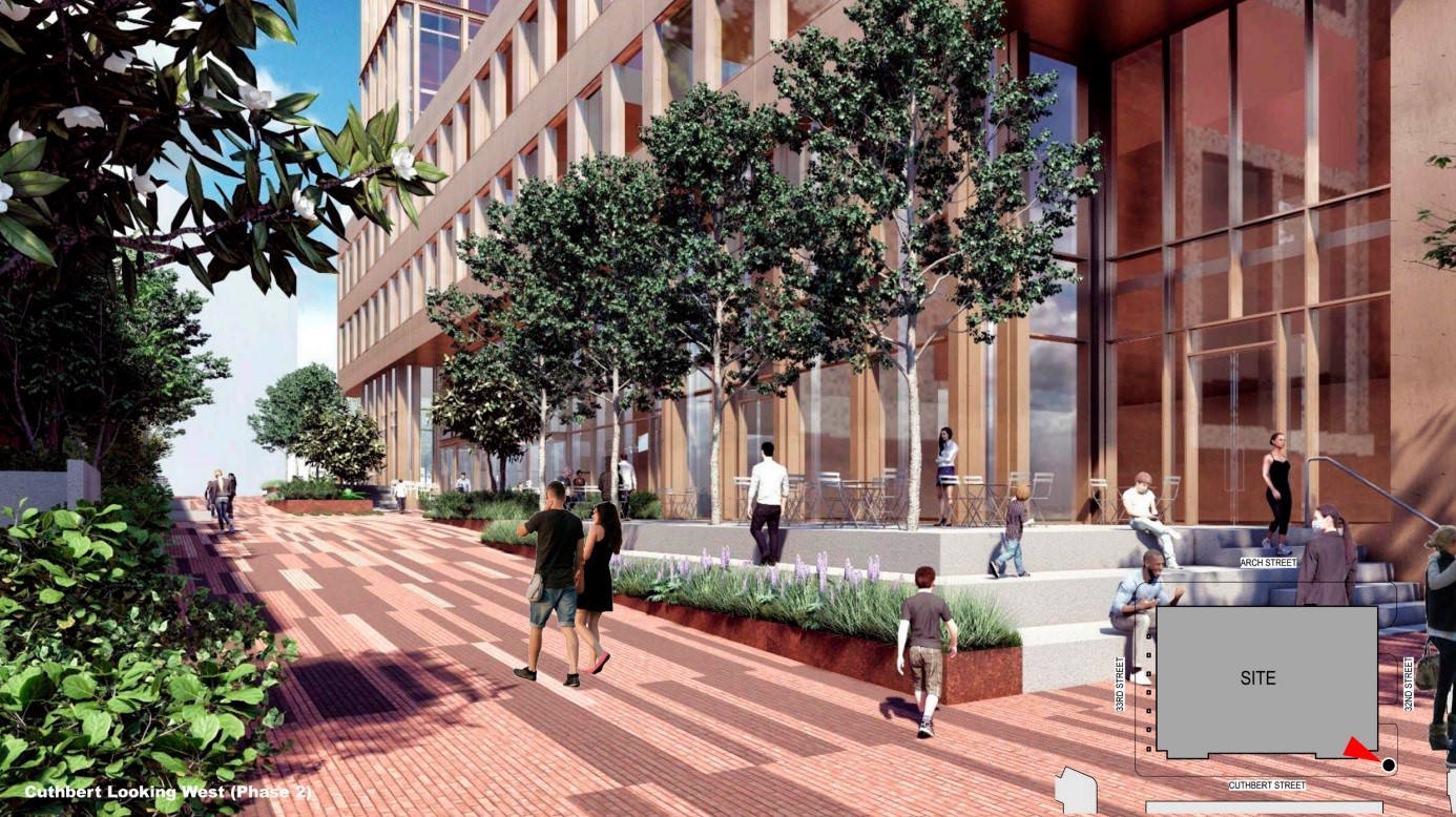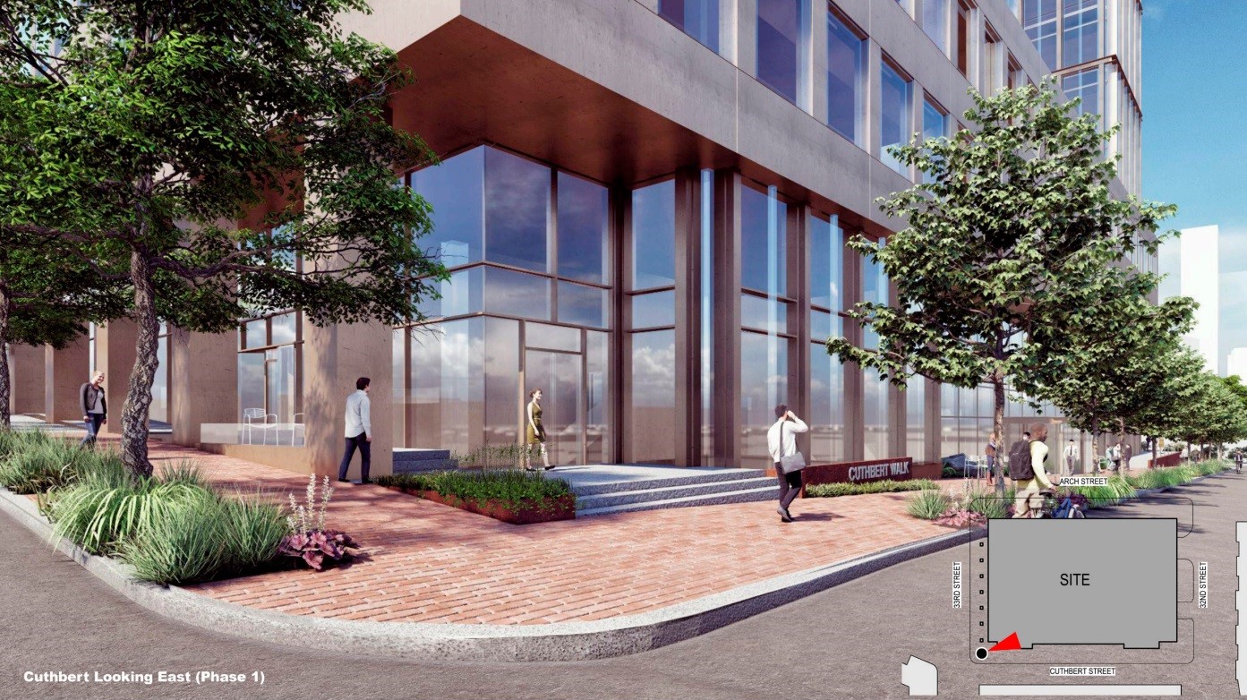 What we did not expect was the inclusion of a Phase 2 of the project. Everything we’ve walked through thus far is part of Phase 1, but Phase 2 will bring us even more walking. Cuthbert Street shall be no more, with a pedestrian-only Cuthbert Walk to take its place. This hardscaped and landscaped walkway will divide the lab from the U.S. Squash Center to the immediate south, and it will further connect to the walkways to both the west and east. Additionally, a landscaped terrace will be added to the fourth floor, providing even more outside access and green space for the project.
