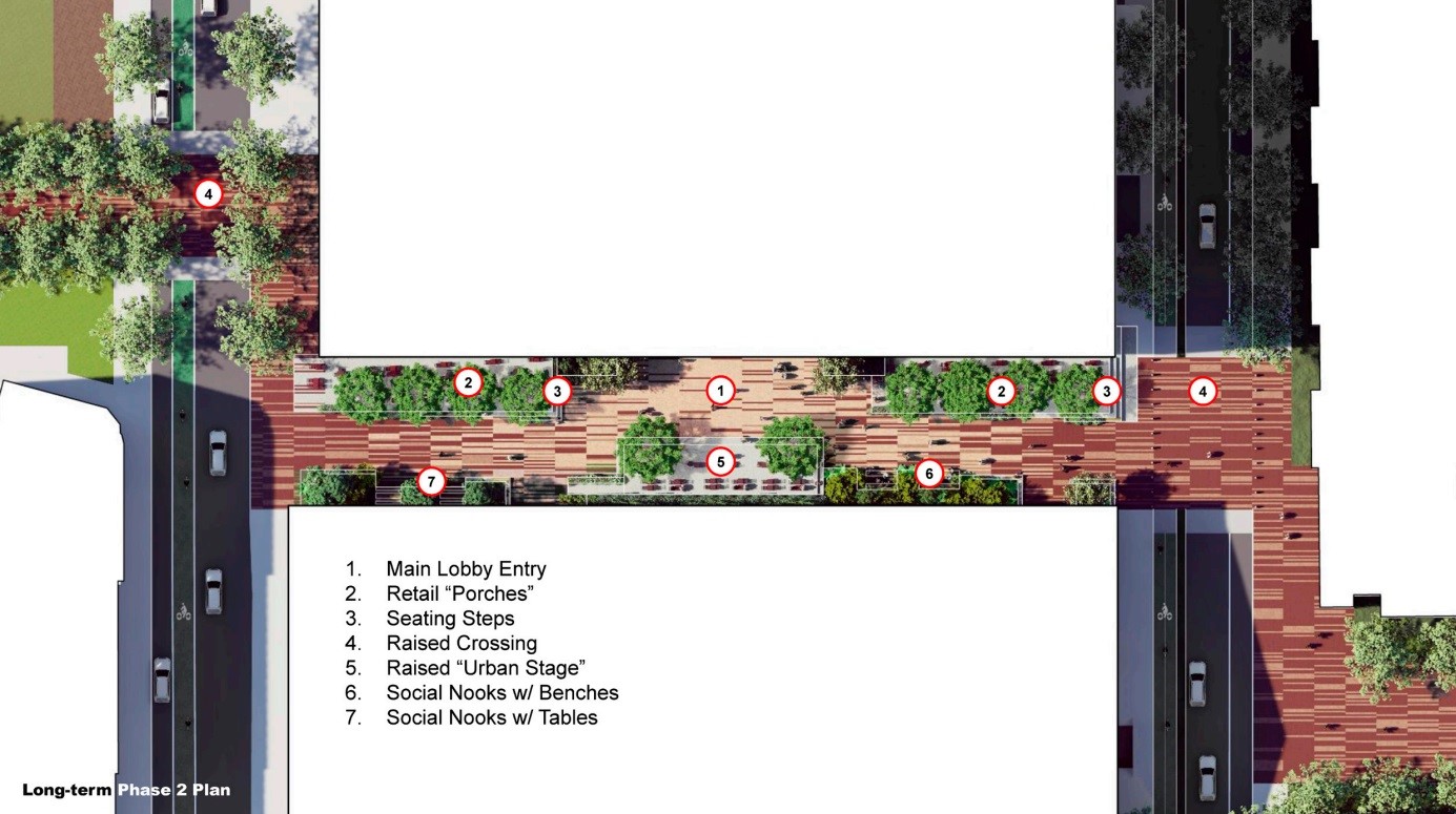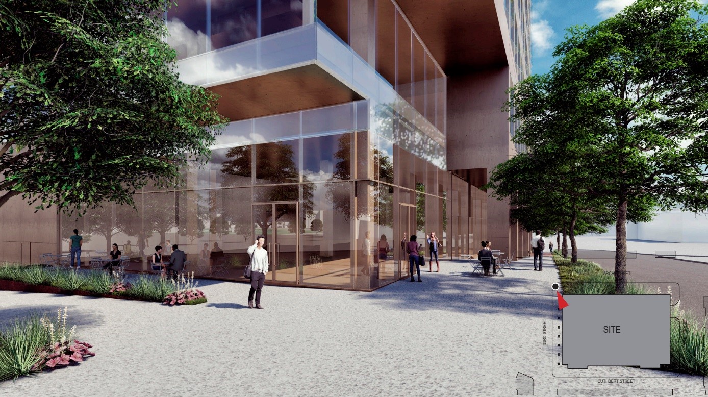 Also new to us were the ground floor plans, with the addition of three retail spaces coming as a bit of a pleasant surprise. The pedestrian-scaled storefronts make the structure seem less intimidating upon approach and the landscaped sidewalks offer a much greener experience then they did previously. Let’s stroll around the future of the site to get an idea of what to expect.