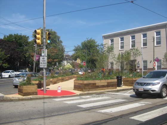 We were in the area the other day, and noticed that the new pedestrian plaza at 42nd St. and Woodland Ave., which we told you about last month, is nearly complete. As you can see from the photos, this effort has taken a somewhat silly little stretch of city street, and turned it into an inviting and attractive public space.