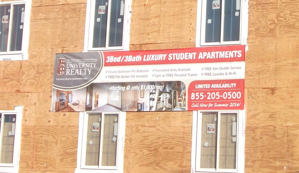 We mentioned earlier that the original modular construction propelled two new projects in the immediate area to break ground. The second one is a fairly large building (4525 Walnut St.) being developed by University Realty, which, by way of the company's name, we assume will be marketed toward local students. We mentioned it last year when the sale happened and permits were pulled. The building is now fully framed and windows are almost finished being installed.