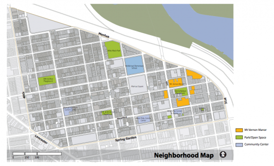 The centerpiece of the planning effort for the Mantua neighborhood, defined by the study as home to 5,924 residents between 31st and 40th Streets, and Spring Garden Street and Mantua Avenue, is the transformation and renovation of the Mt. Vernon Manor Apartments, a 21 building, 125 unit complex constructed by HUD in 1978. As of June 2012, according to the plan, only 55 units were occupied. Many of the locations are worn down, and suffer from mold, mildew and damaged gutters. Plans call to improve the living conditions in two phases, the first targeting households with a household income of or at 60% of AMI. Beyond that, the plan, as usual, calls for improvements to public spaces, schools and general community aesthetics.