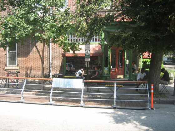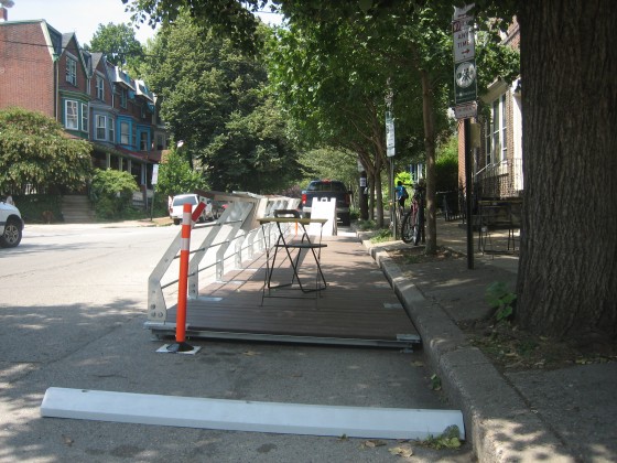 Despite looking like an extension of Green Line Cafe’s outdoor seating, the Parklet is most definitely a space for everyone and not an exclusive venue for the latte sipping set. One of the ideas behind Parklets is to create public space for anyone to enjoy, particularly in areas where this might be lacking. Which makes it sort of curious that the very first Parklet in Philadelphia would be situated directly across the street from Clark Park, one of the best public spaces in the city. While the marketing angle of locating the first Parklet at a corner that gets good foot traffic will likely generate some decent buzz, we’re not sure that people are going to understand its desired purpose or function because of its location.