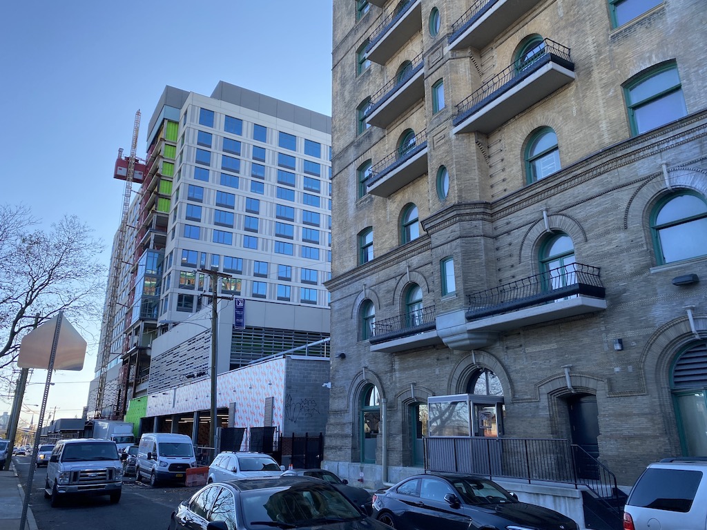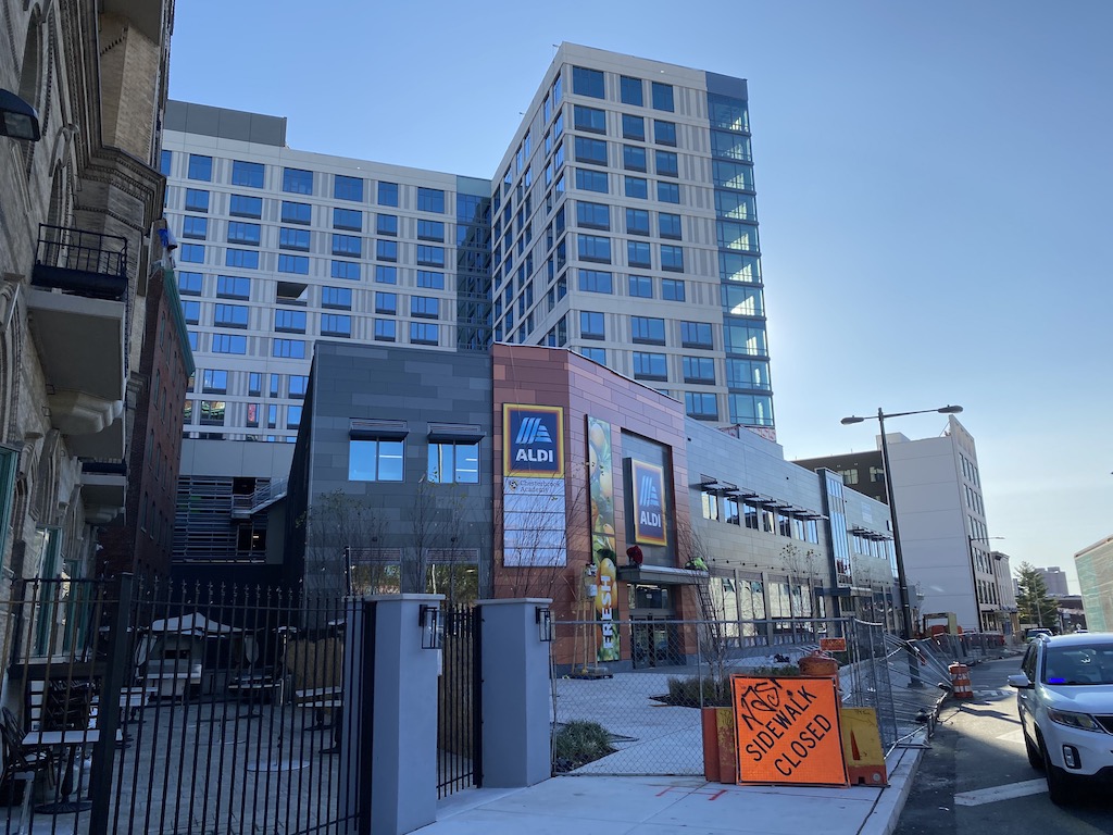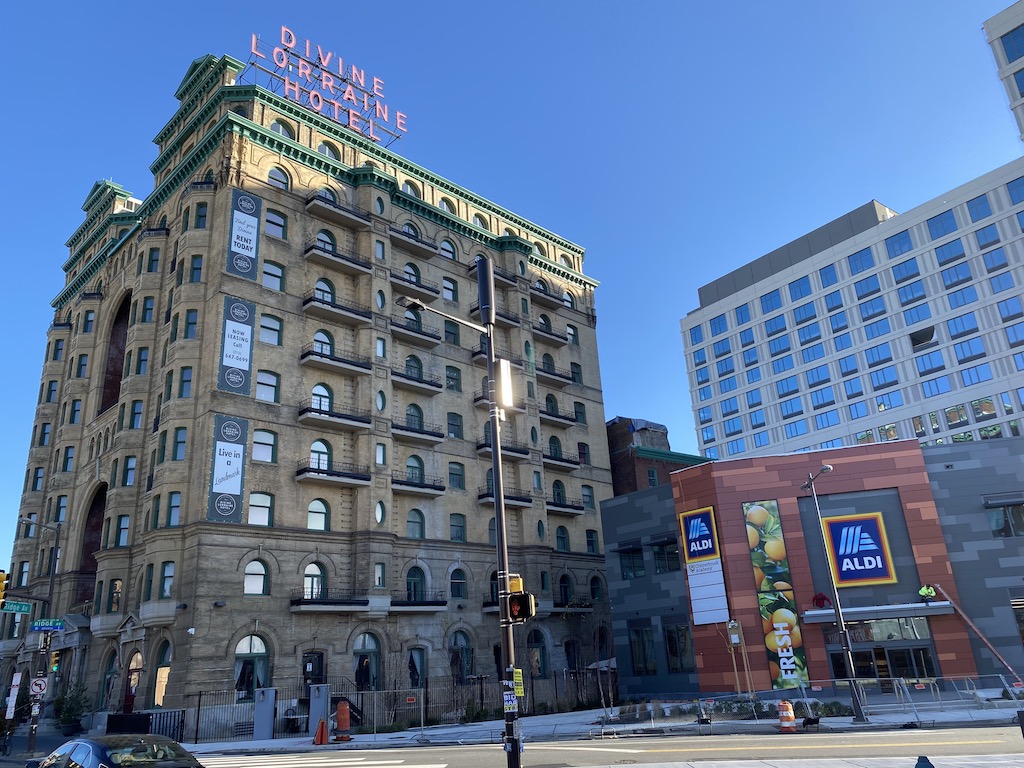 Despite its non-Broad Street address, 13hundred Fairmount is the largest project to come down the pike on North Broad since renovation work started at the Divine Lorraine. We first told you about it over five years ago, though construction didn’t start until 2018. It may have taken a little while to get moving, but since construction began it has moved at a rather rapid pace, and now the exterior of the building is nearly buttoned up. The Aldi supermarket on the first floor of the project will be ready to open any day now, just in time for a Thanksgiving where many people will be unexpectedly cooking for themselves. With the entrance to the supermarket so close to the Divine Lorraine, the juxtaposition of the historic and the contemporary is a bit jarring.