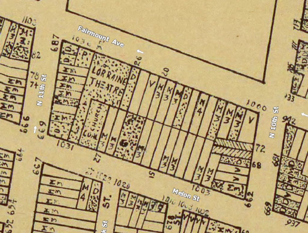 The block bounded by 10th, 11th, Fairmount, and Melon Streets in West Poplar has an interesting past, despite its somewhat glum recent history. Once upon a time, the Lorraine Theater stood on this block, created from a combination of an old stable and a private home. The theater was built in 1925, received a face lift and reopened as the Booker Theater in 1941, and ultimately closed in 1956. Like many old cinemas, the building transitioned into a church after it ended its run as an entertainment venue. Also like many old cinemas, the building was eventually demoed. The site has been vacant for years, at least since the mid-1990s.
