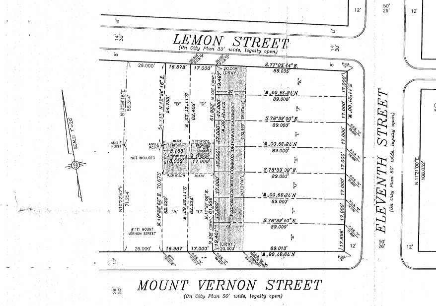 Passing by the other day, we discovered that work has begun on the project that will replace the stately church and school buildings. Three foundations are currently in the ground, and eight more will soon follow. According to the L&I Map, there are plans here for eleven new buildings, including four single family homes and seven duplexes. The homes will front Mount Vernon and Wallace Streets, while the duplexes will front 11th Street. A drive aisle will run between the two named streets, with one-car parking for the single-family homes and two-car parking for the duplexes.