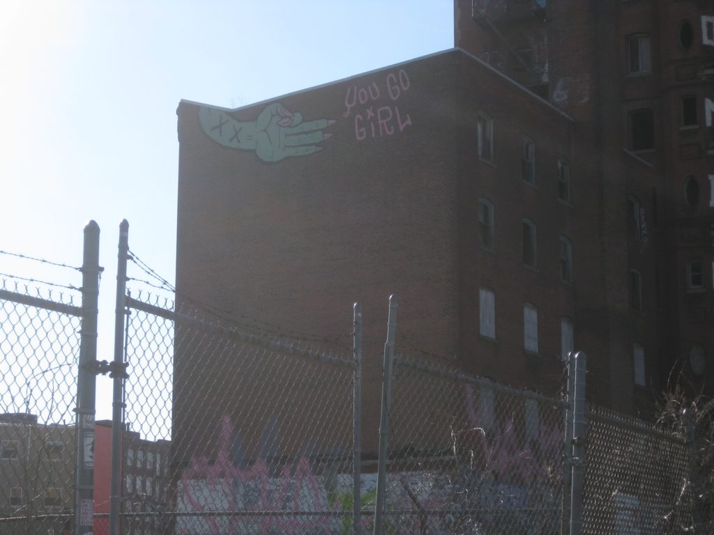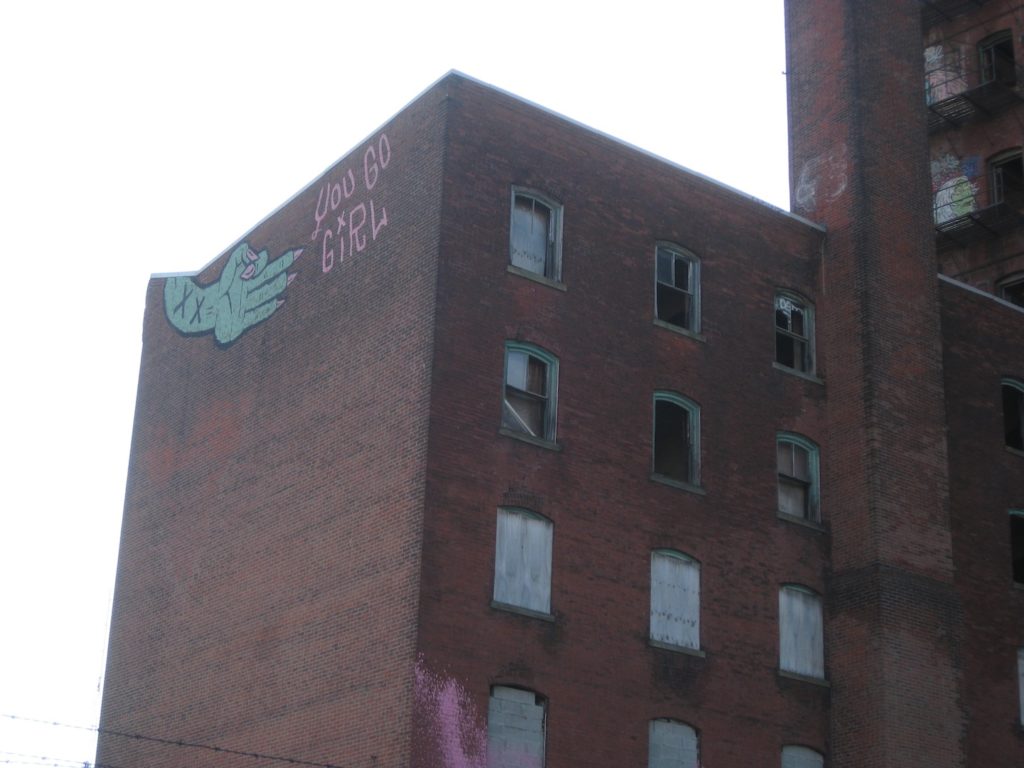 We're no experts when it comes to painting buildings that don't belong to us, but we have to say we're a little flummoxed as to how exactly the folks who painted the hand and hilarious message were able to do their work. Can anybody out there shed some light on the subject? And while we're at it, can somebody please redevelop this building already?