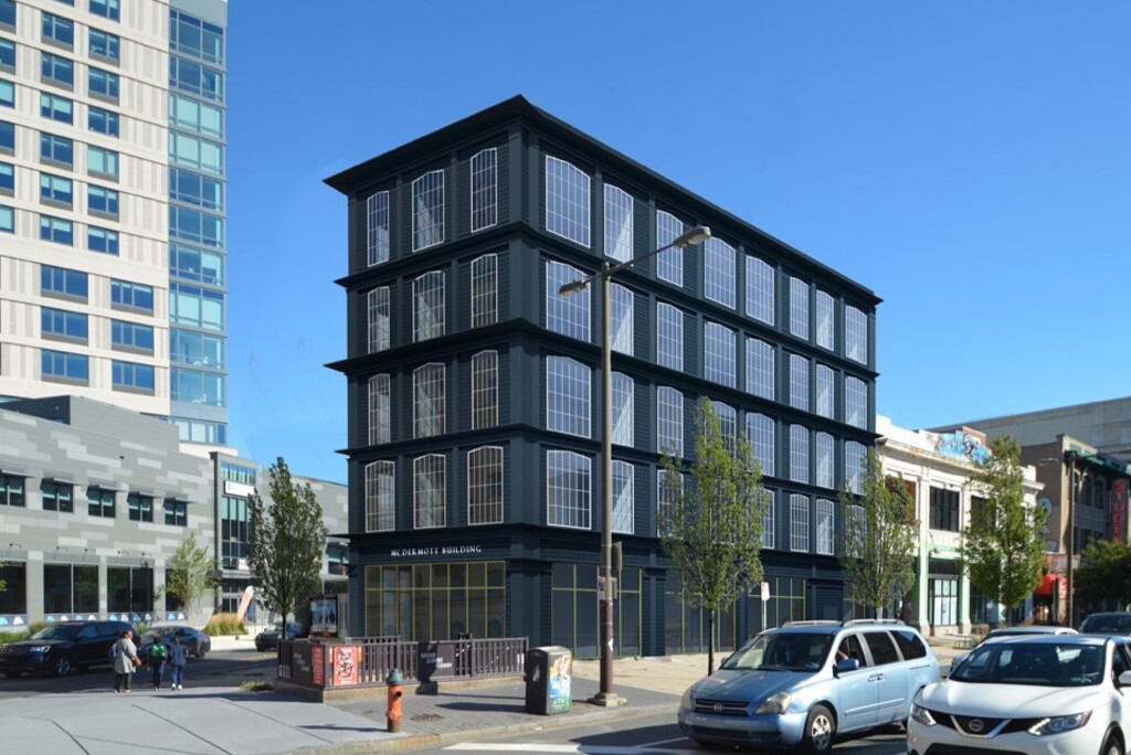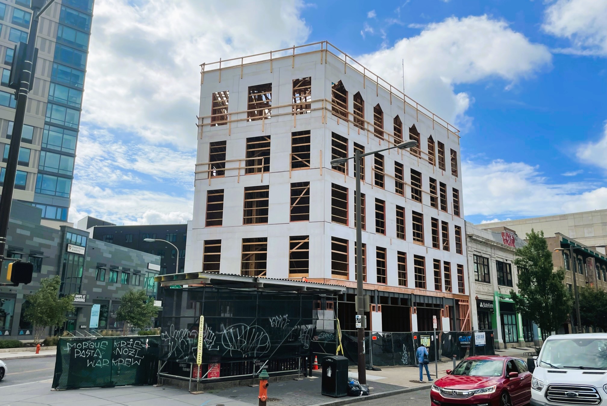 In addition to these upper floor apartments, this project from Philly Capital Group and flatiron superstars Ambit Architecture will add 1,400 sqft of commercial space immediately next to the BSL/Broad-Ridge spur subway entrance at the north end of the corner. Called The McDermott after a pub that anchored the corner in the early 20th century, this striking building will feature a neo-industrial look, with its dark facade punctuated by the large windows, all of which feature a slight point at the top – perhaps a reference to the property’s shape? Things have been moving quickly since our last visit, as the building is now at its full five-story height, creating an impactful presence on this prominent corner just across from the grandeur of the Divine Lorraine.