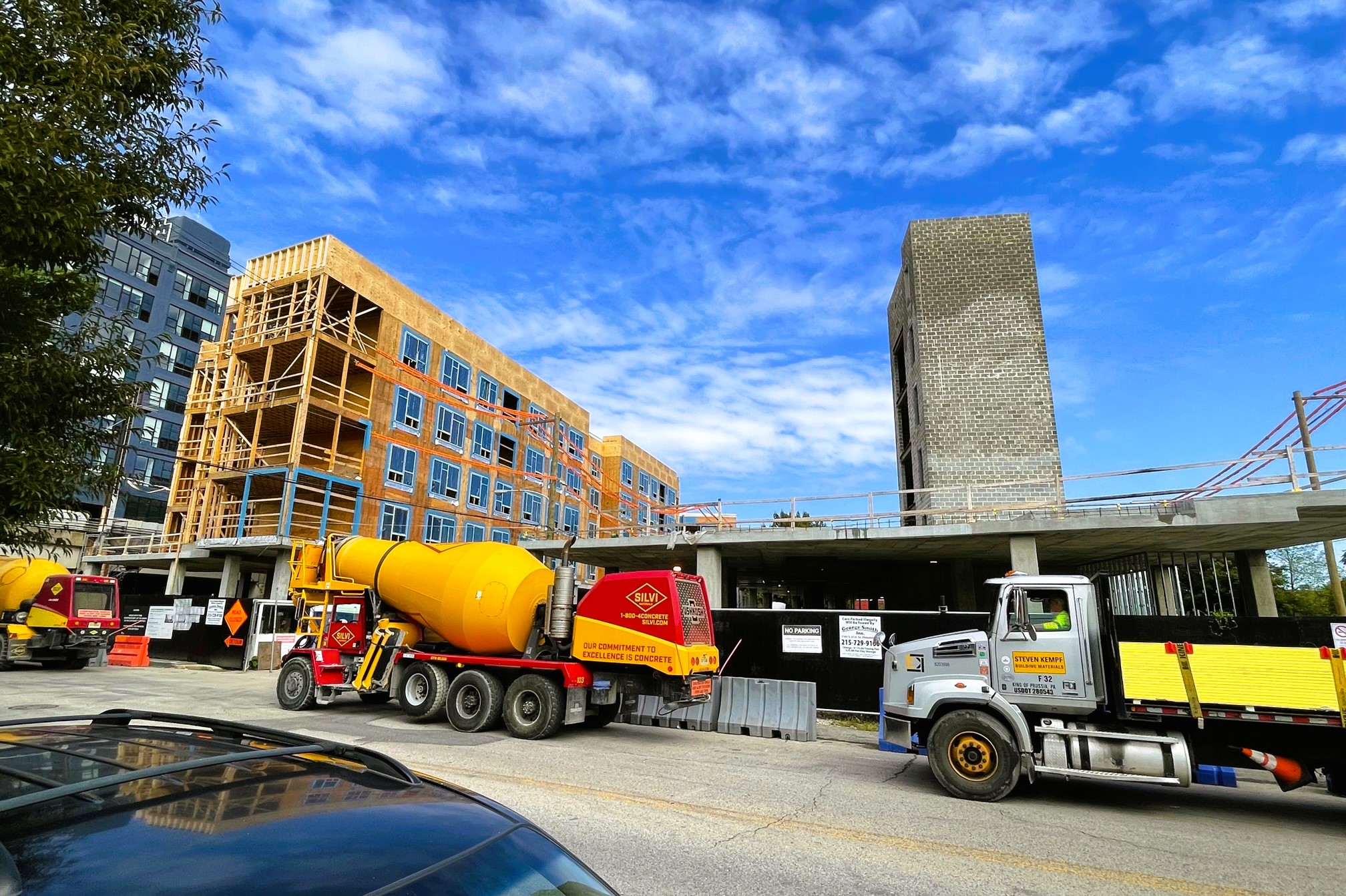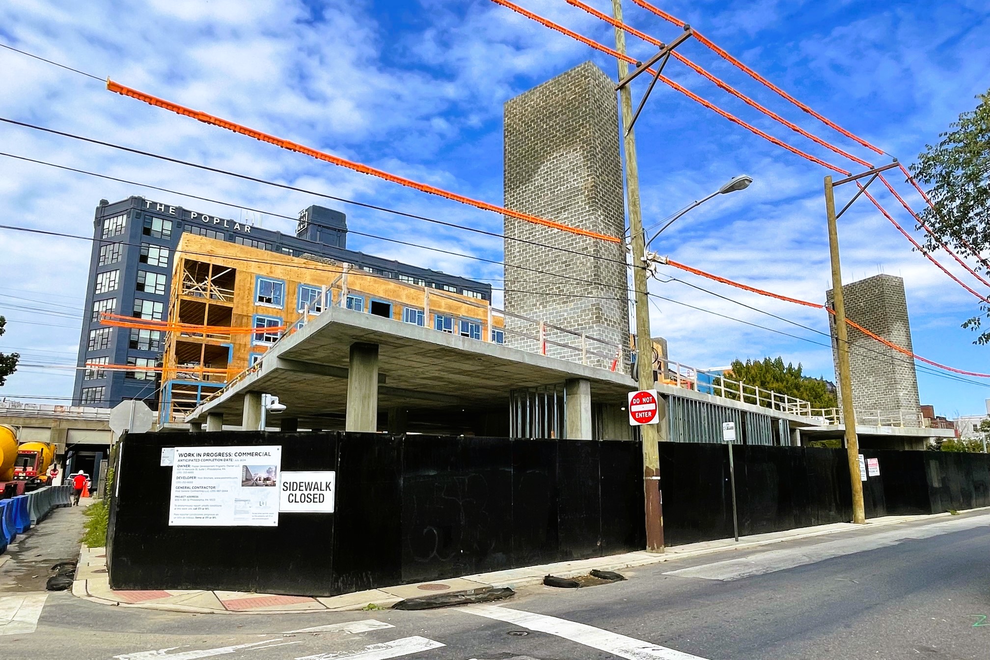 After stopping by a mysterious property at 8th & Girard the other day, we couldn’t help but make our way further down 8th St. to 900-18 N. 8th St. to see what we could see. Happily, what we saw was exactly what we had hoped, as construction is now full steam ahead on The Darien, a two-building project that we last visited in March on a development excursion across the city. Back then, things were just getting started on this project from Post Brothers and CosciaMoos Architecture, but both buildings are now well out of the ground.