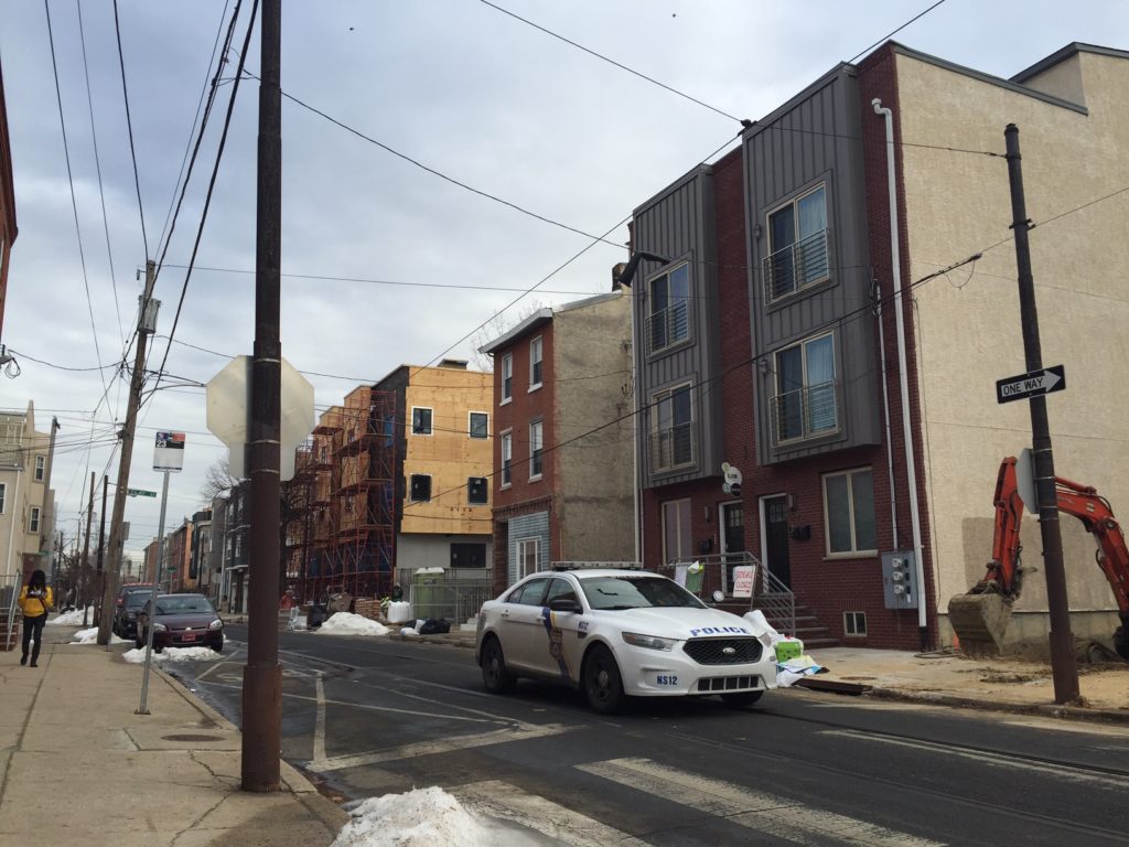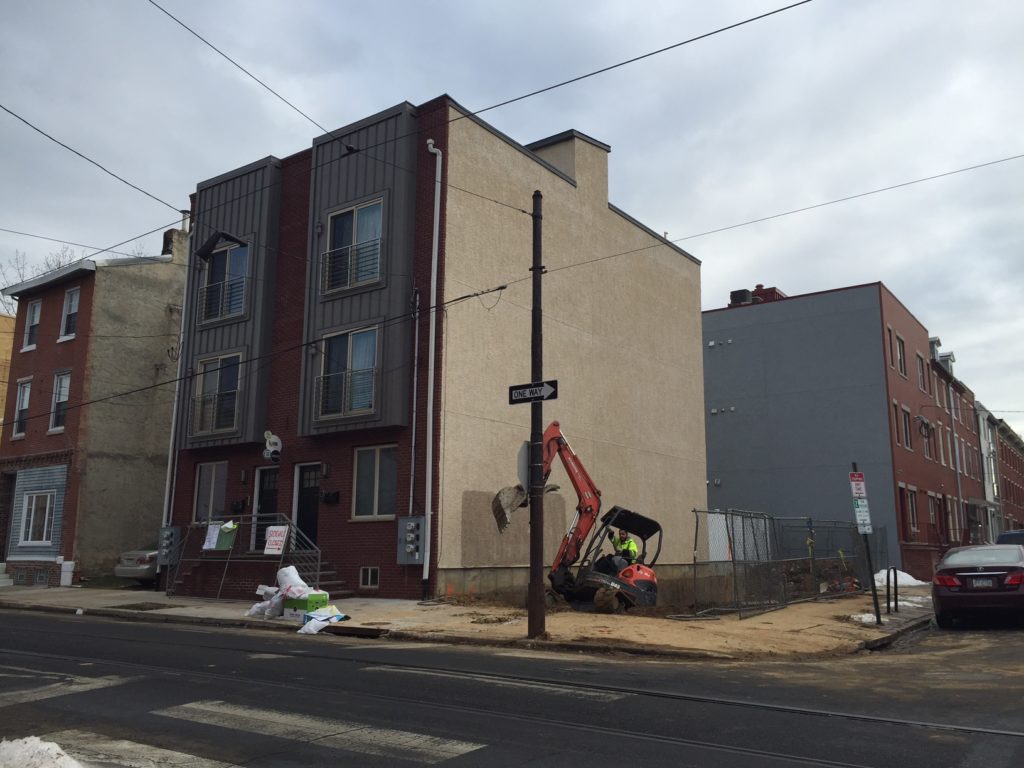Just half a block to the north, another building is under construction, several months ahead of the aforementioned mixed-use project. We actually visited this property a couple years back, and told you about plans for two duplexes for this property, located at the corner of 12th & Mount Vernon. Somewhere along the way, the plans changed and new developers are instead building a triplex with one parking spot. As we mentioned previously, the new building will block the view of a mural on Mount Vernon Street, but won't cover it because there's still two vacant lots next door.