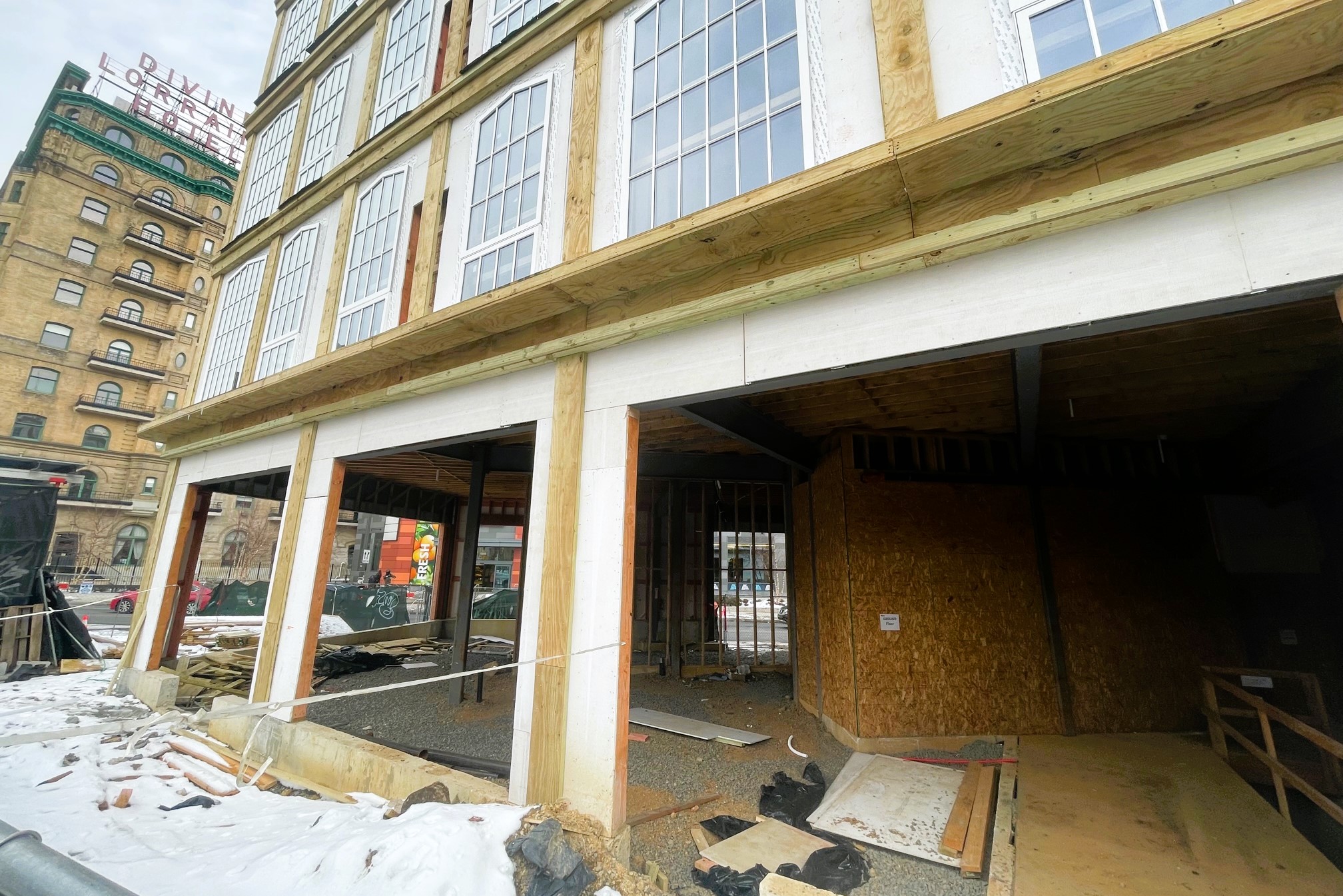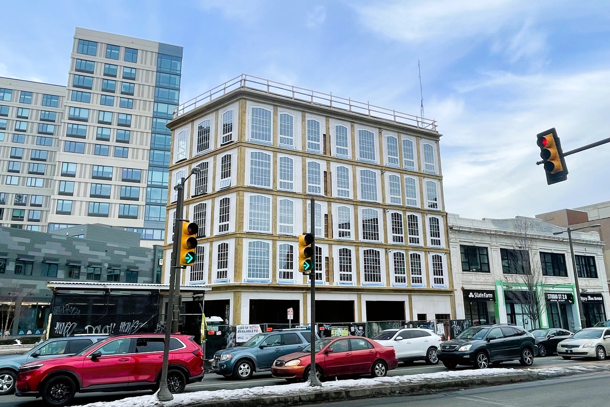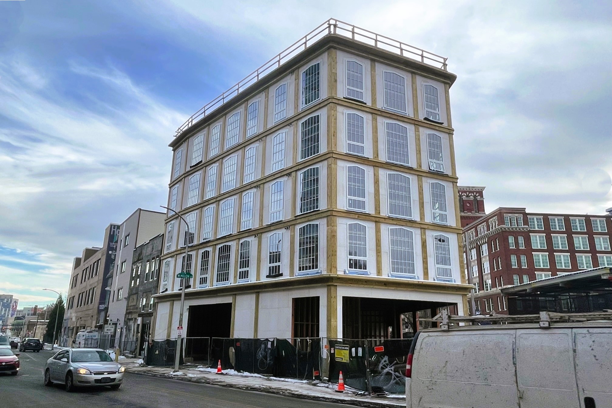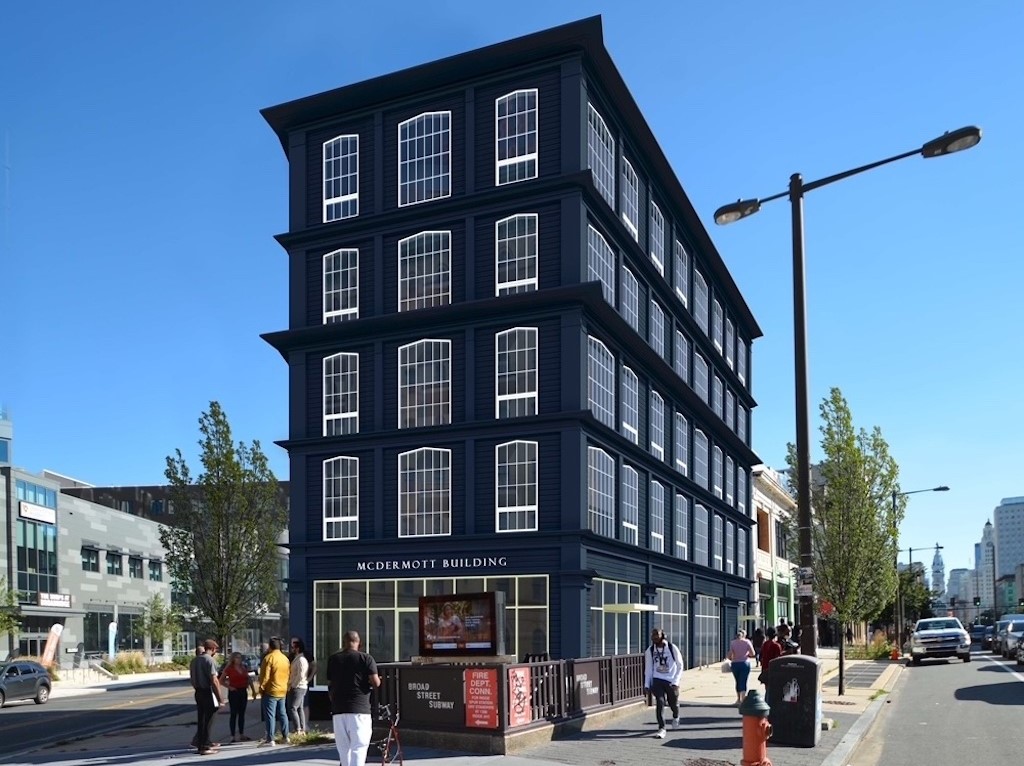 It sure seems like Broad Street has had a bit of magnetism to it lately, on both ends of the thoroughfare. And today, we are once again drawn back to a familiar corner, where The McDermott at 695 N. Broad St. is literally rounding into form. This 20-unit apartment building is going up on the skinny parcel where Jimmy G’s steaks once stood in the shadow of the stately Divine Lorriane and, more recently, the huge Broadridge project next door.