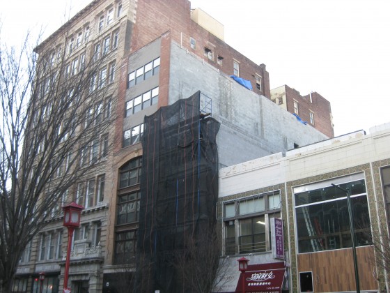 Last spring, we told you about plans to build an addition on the top of 1025 Arch St., just down the street from Reading Terminal Market and the unfortunate Home2 Suites hotel. As you can see in the photo below, this addition has, in fact, taken place, though work probably isn't