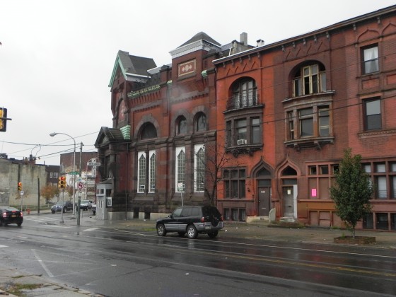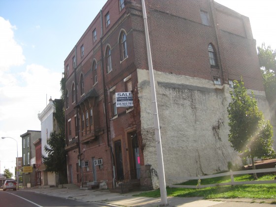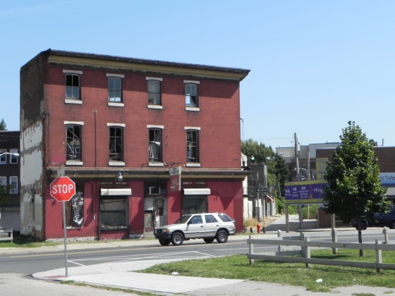 Like this abandoned thinly triangular shaped three-story brick structure on Ridge