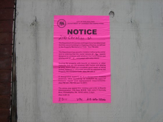 This time we spotted one on the front door of 1818 W. Girard Avenue. Posted October 10th, it demands that