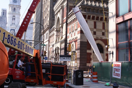 On Saturday, Lenfest Plaza took one step closer to completion with the installation of Claes Oldenburg's sculpture, Paint Torch. From the looks of it, considerable progress has been made at this site since our last update. Check the our mini-gallery of the installation. Photos are by Sean Tucker.