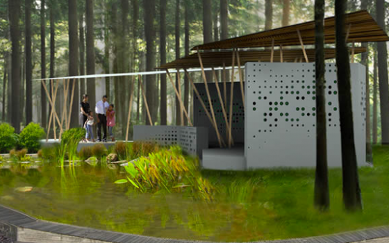 Rebecca Popowsky and Riggs Skepnek designed the winning woodland Bambooze shelter as part of the Gimme Shelter showcase for the Schuylkill Center for Environmental Education, a 350-acre nature preserve in the Roxborough neighborhood of Philadelphia. The Gimme Shelter competition was meant to build awareness of sustainability, encouraging collaboration between designers to promote