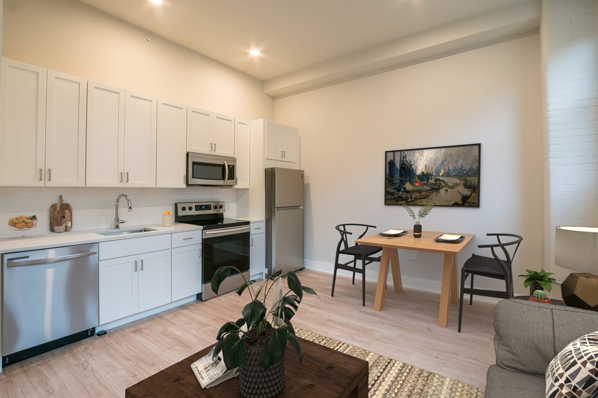 Don’t miss this breathtaking studio, 1 bathroom apartment within the historic Smith School building! This unit has everything: hardwood floors, mini split system heating/cooling, recessed lighting, washer/dryer in unit and massive windows! The kitchen has white cabinets with sleek hardware against textured white subway tile back splash, quartz counter tops, a garbage disposal and stainless steel dishwasher, microwave, refrigerator and electric range. The bathroom features a vanity with the same counter tops that match the kitchen and a shower/tub.