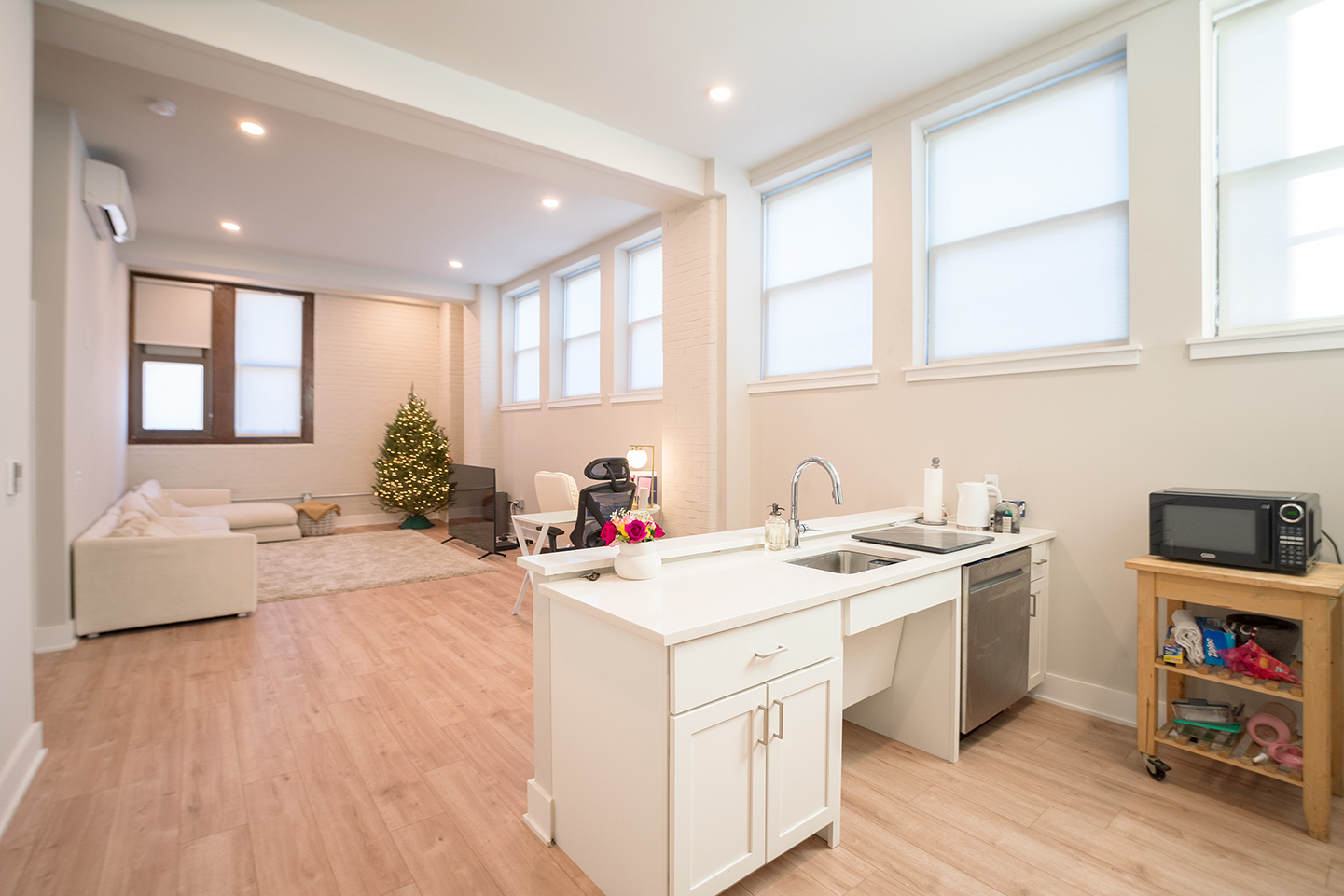A very unique ADA compliant 1 bedroom, 1 bathroom unit in the newly renovated Smith School apartment building! You will enjoy hardwood floors, mini split system heating/cooling, recessed lighting, soaring high ceilings and no shortage of space! The unit features a modern, all white kitchen with a breakfast bar, stainless steel appliances, quartz counter tops and subway tile back splash. This overlooks the massive open living area that is lined with large windows and stylish white painted brick walls. The spacious bedroom is tucked away with its own closet and is adjacent to large full bathroom with a shower/tub combination and a quartz vanity. Additional amenities include a washer/dryer closet and access to two shared outdoor spaces that include a patio and an expansive roof deck with stellar views.