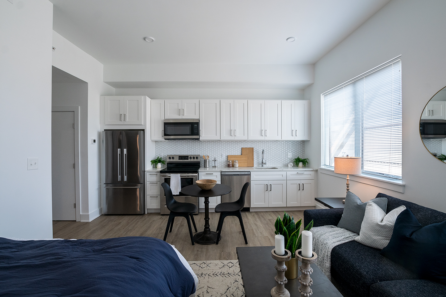 This sunny studio has a spacious layout, tons of natural light, and modern finishes including hardwood floors, central AC, in-unit laundry, as well as recessed lighting. The kitchen is beautifully designed with white cabinetry, quartz countertops, stainless steel appliances and honeycomb backsplash tiling. The contemporary full bathroom features a shower/tub and sleek vanity with a unique lighted mirror. Finally, enjoy building amenities that include a shared roof deck with stunning city views as well as a convenient bike storage room.